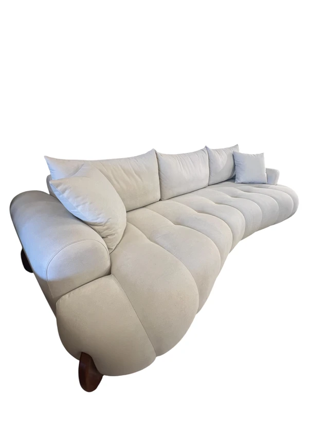 ספה דגם טורי במראה חצי עגול מבנה יחודי וקו מהממם, מבנה משולב עץ מלא עם ספוגים איכותיים רגלי הספה גוון אגוז ,